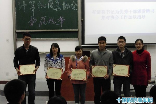 新闻网讯(文/李阳 /张小盘419日晚,计算机信息协会在4101教室举行表彰先进暨换届选举大会。信息与智能工程系党总支书记莫足琴、第五届计算机信息协会技术部部长、现图文信息中心教师赵俊杰老师、汽车协会负责人、院勤工助学中心负责人、信息与智能工程系学生会负责人以及计算机信息协会全体成员出席参加了本次大会。