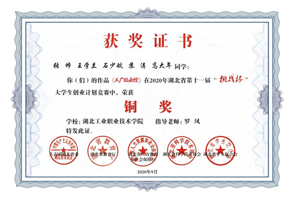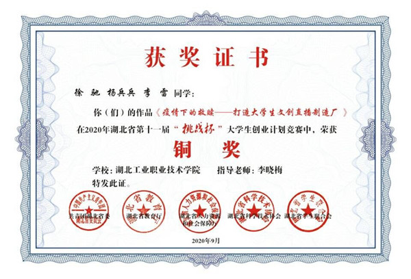新闻网讯(通讯员李晓梅)近日,第十一届“挑战杯”湖北省大学生创业计划竞赛落下帷幕,开云官网双创团队斩获两枚铜奖。开云kaiyun官方网站2018级电气自动化技术专业张帅学生团队项目《工厂级云控》、开云kaiyun官方网站2019级电气自动化技术专业徐驰学生团队项目《疫情下的救赎——打造大学生文创直播制造厂》获大赛铜奖。